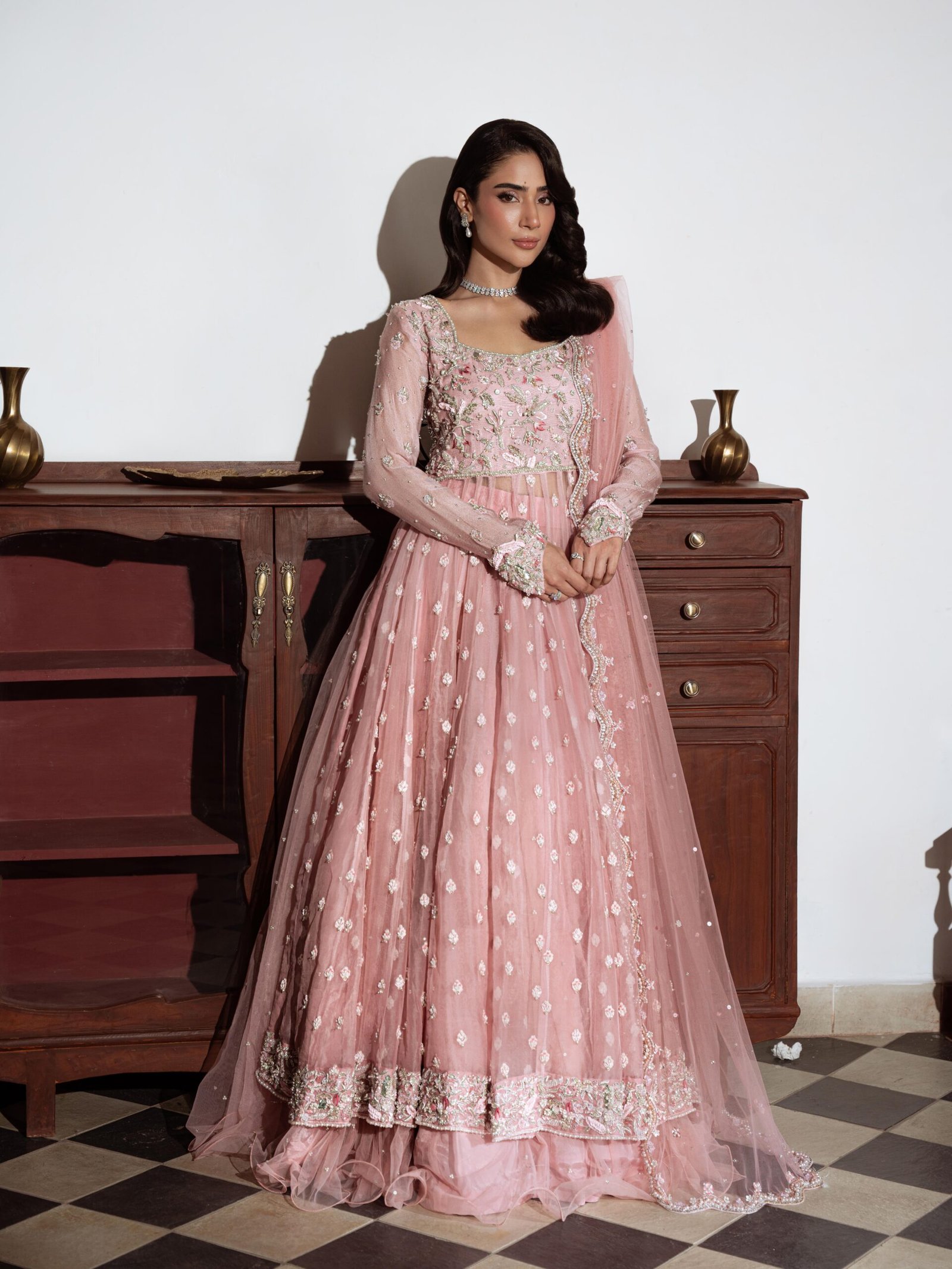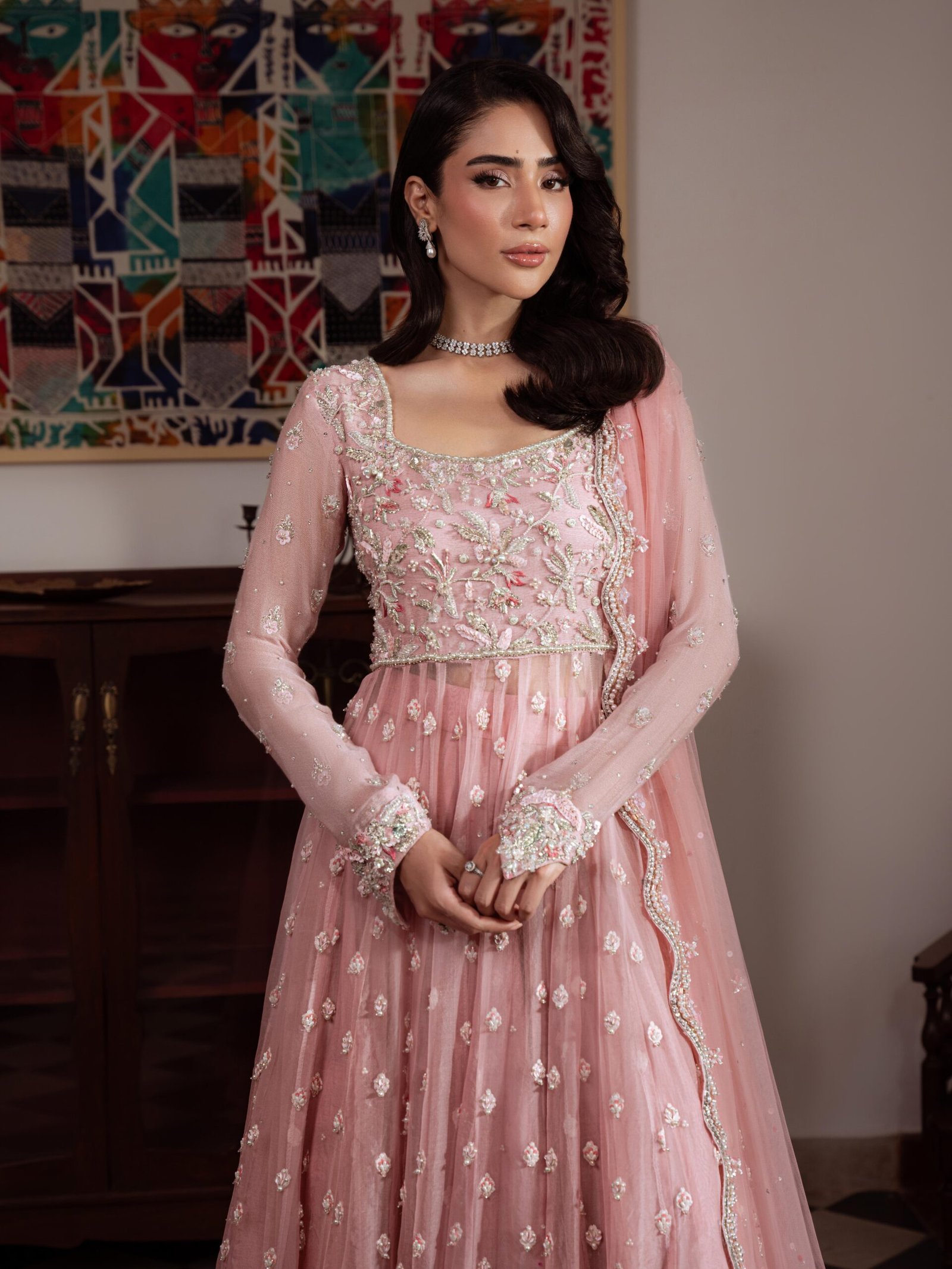 A dreamy kalidar in a delicate pure organza, bought to life with pearls, sequins and thread accent. Outfit is beautiful adorned with fully handwork. It comes with embellished underskirt and scalloped net dupatta.