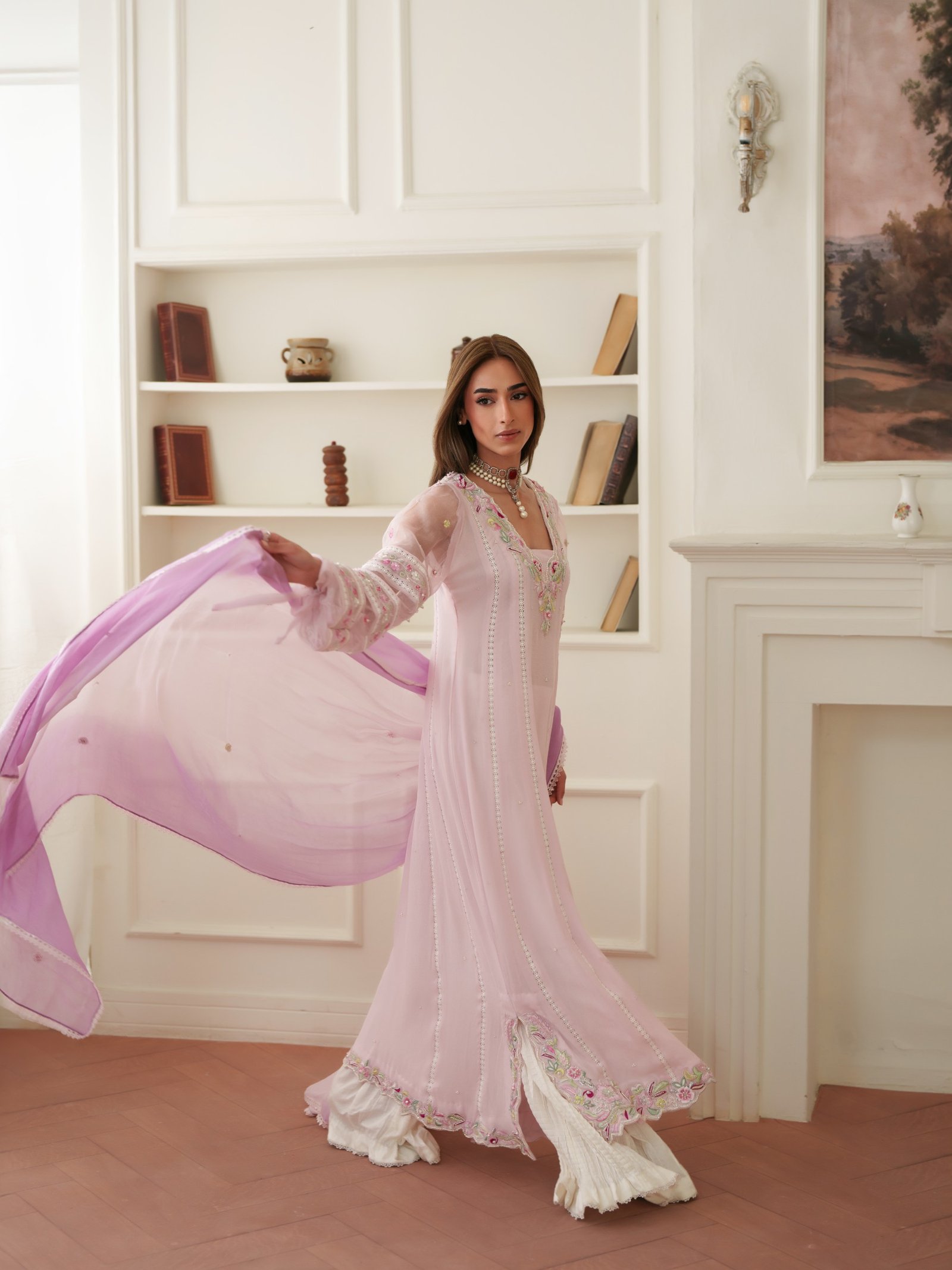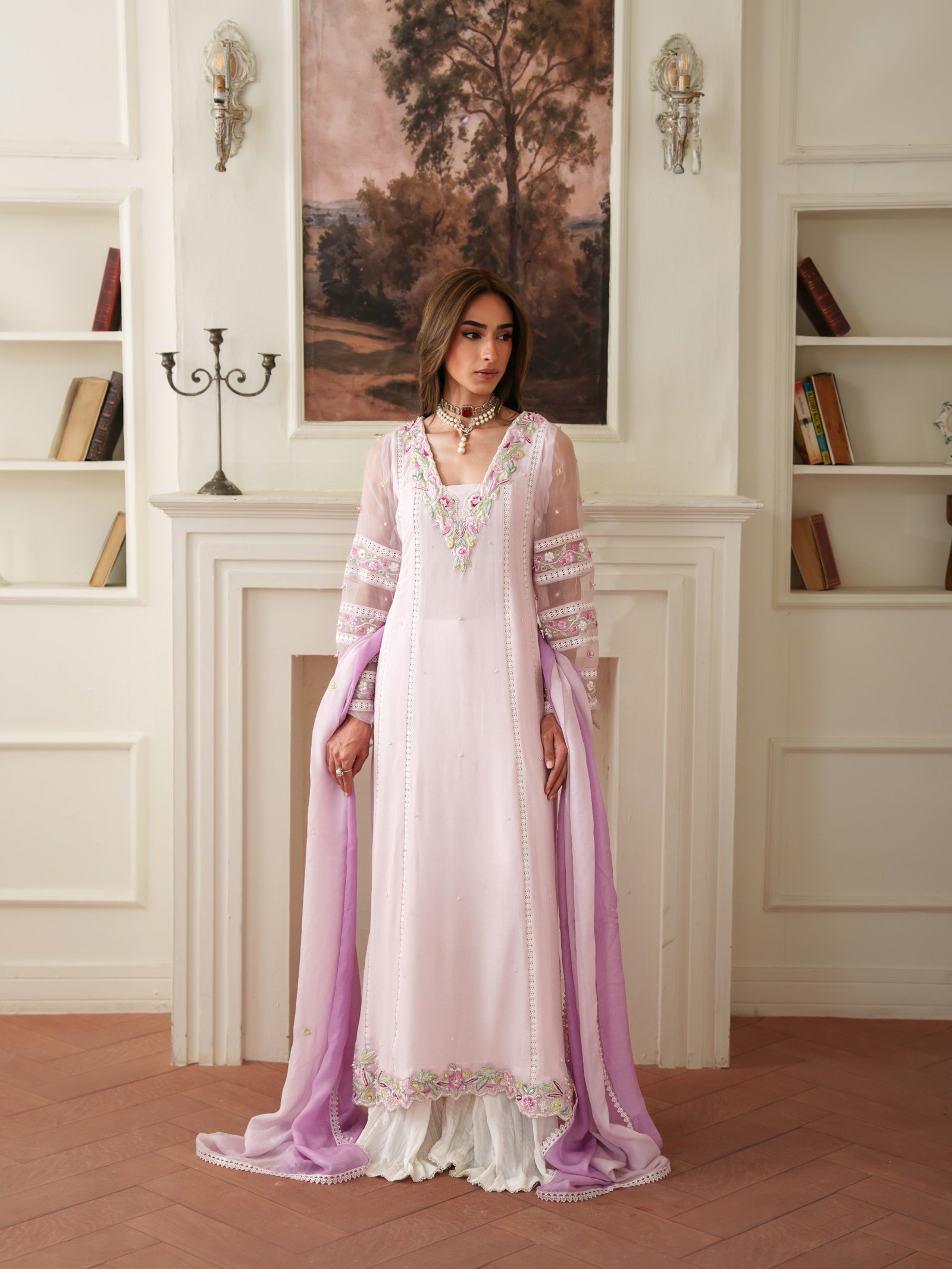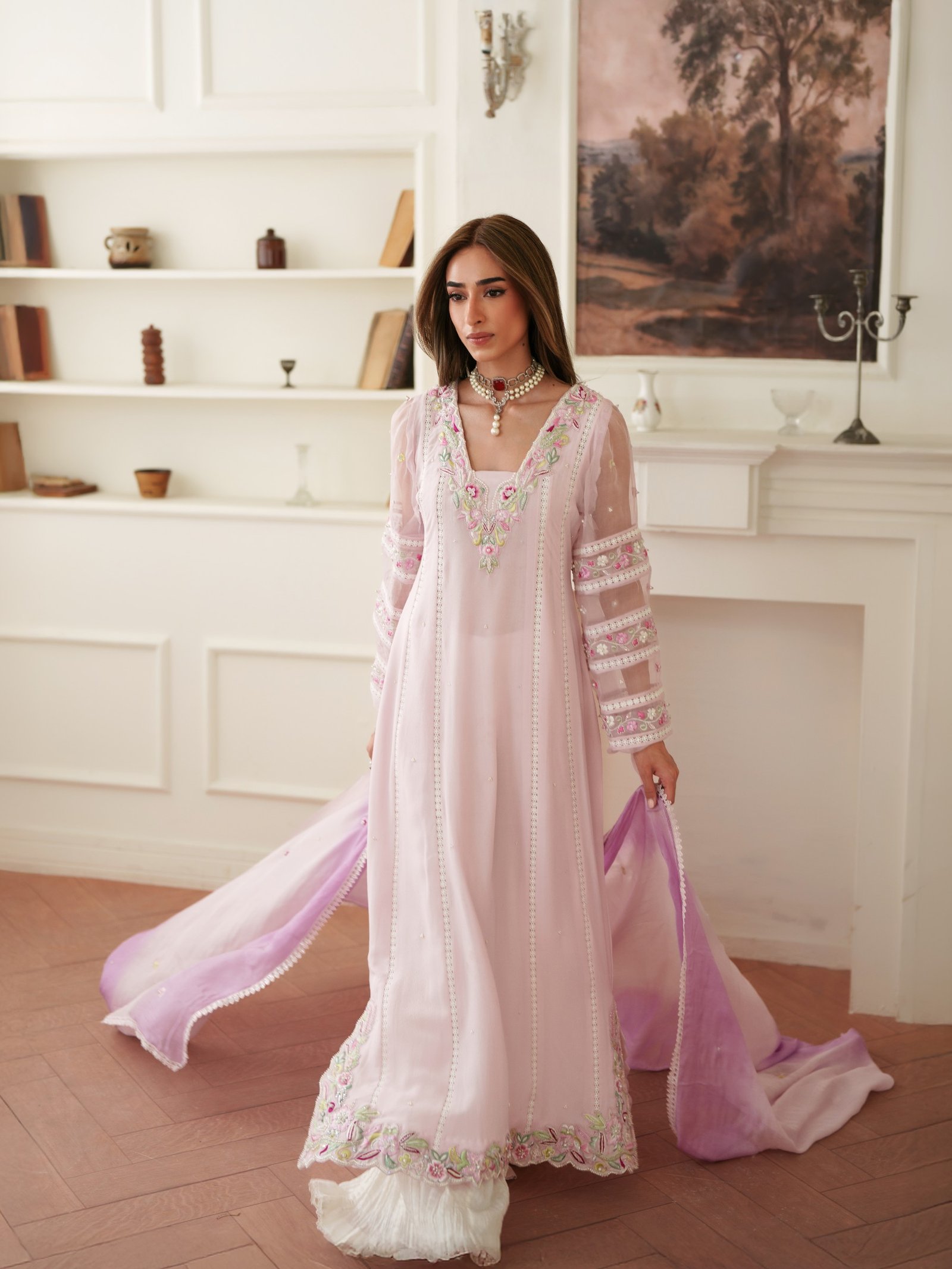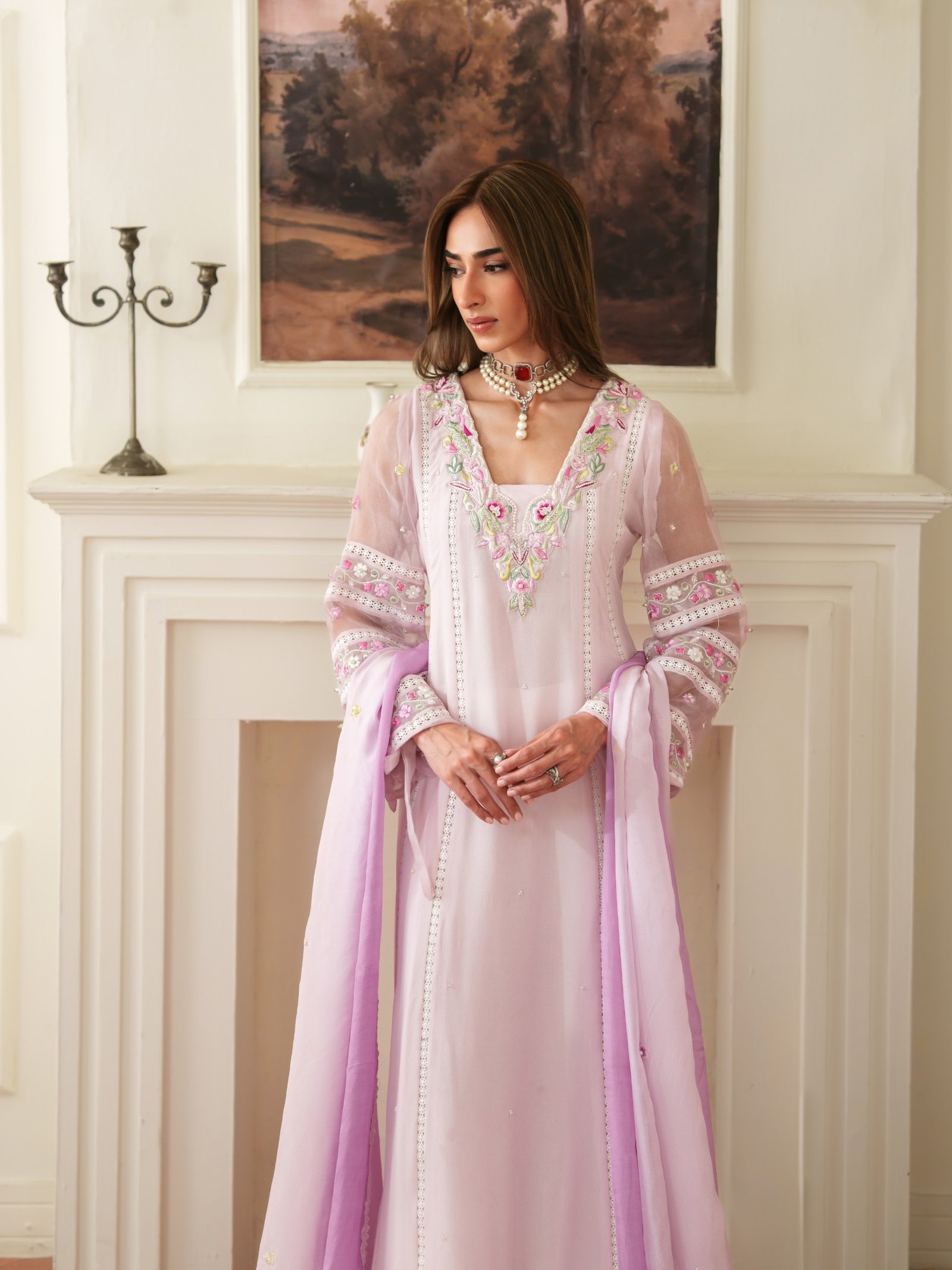 Soft and romantic, Roselle is designed in flowing crepe chiffon with subtle embellishments that enhance its feminine charm. Paired with a comfortable viscose trouser and a smooth silk dupatta, this outfit offers effortless grace for both day and evening wear.