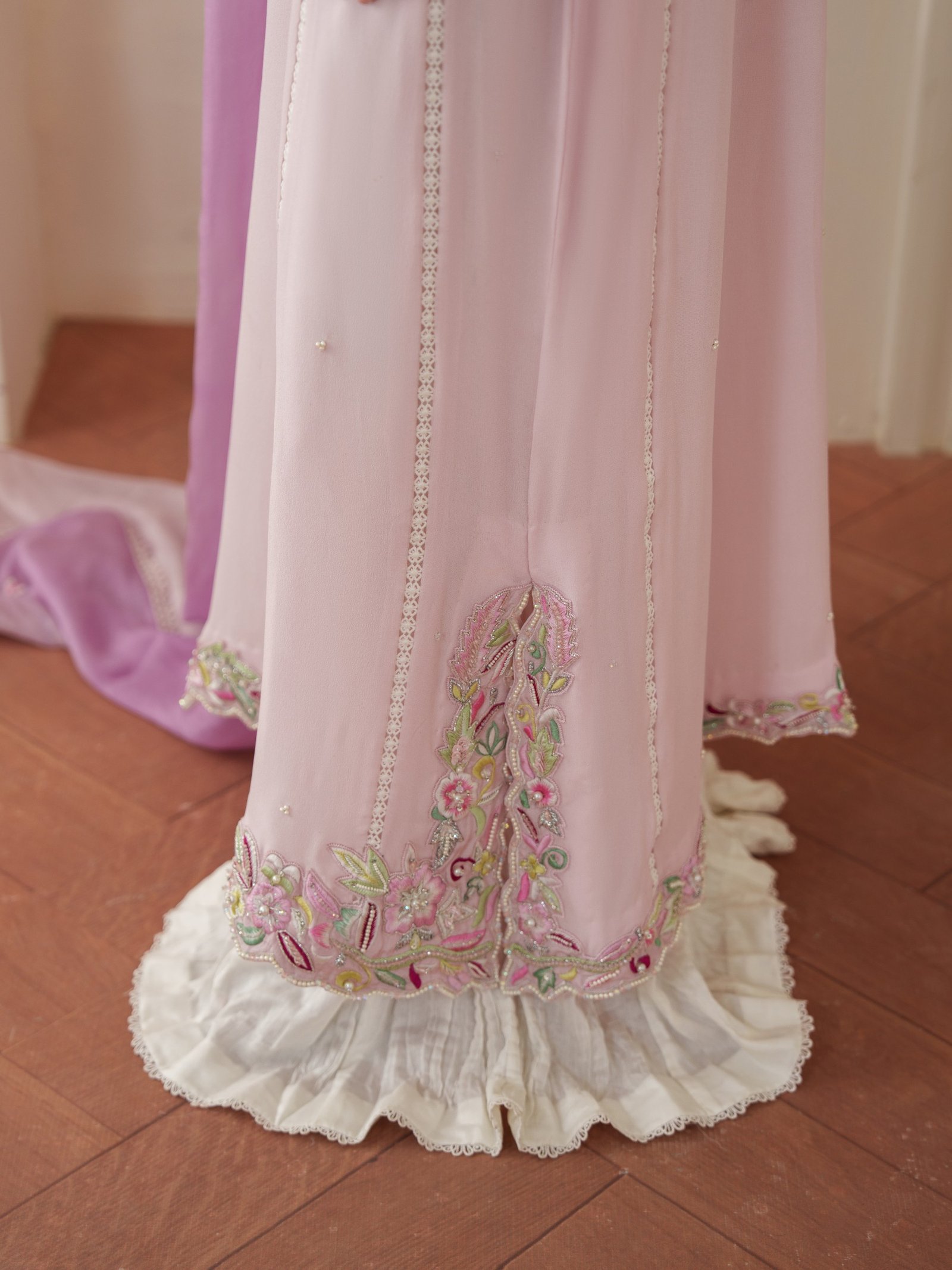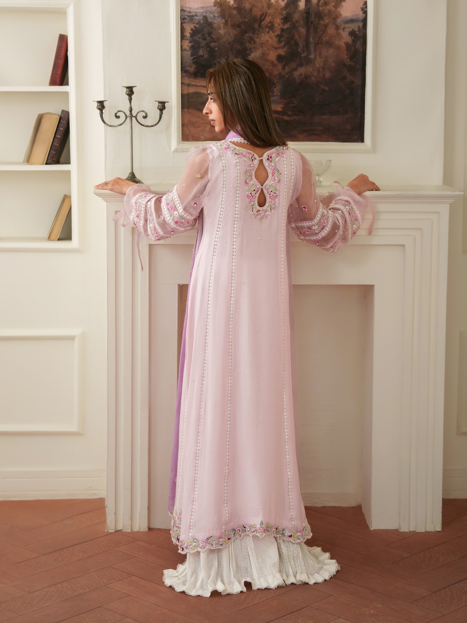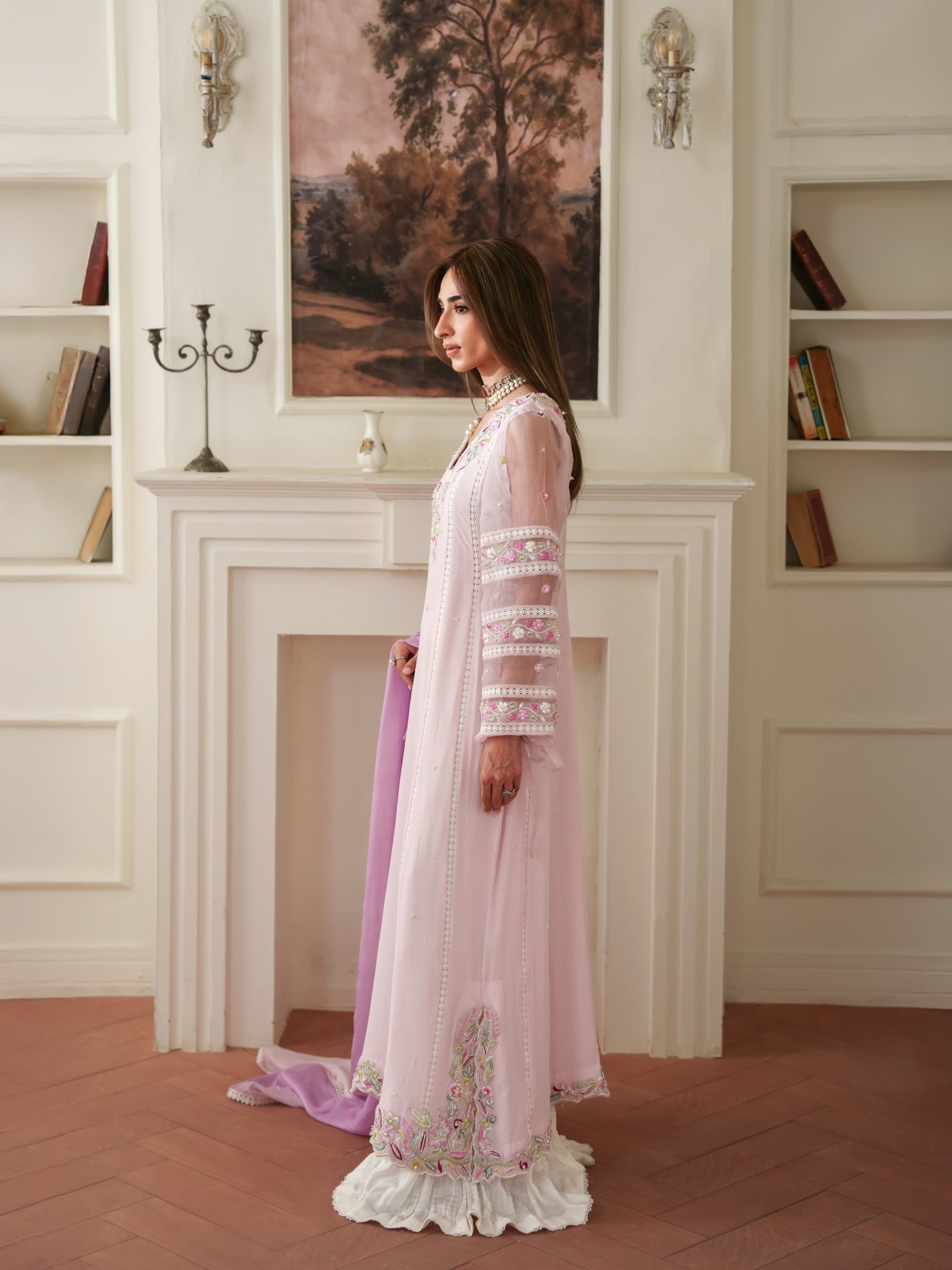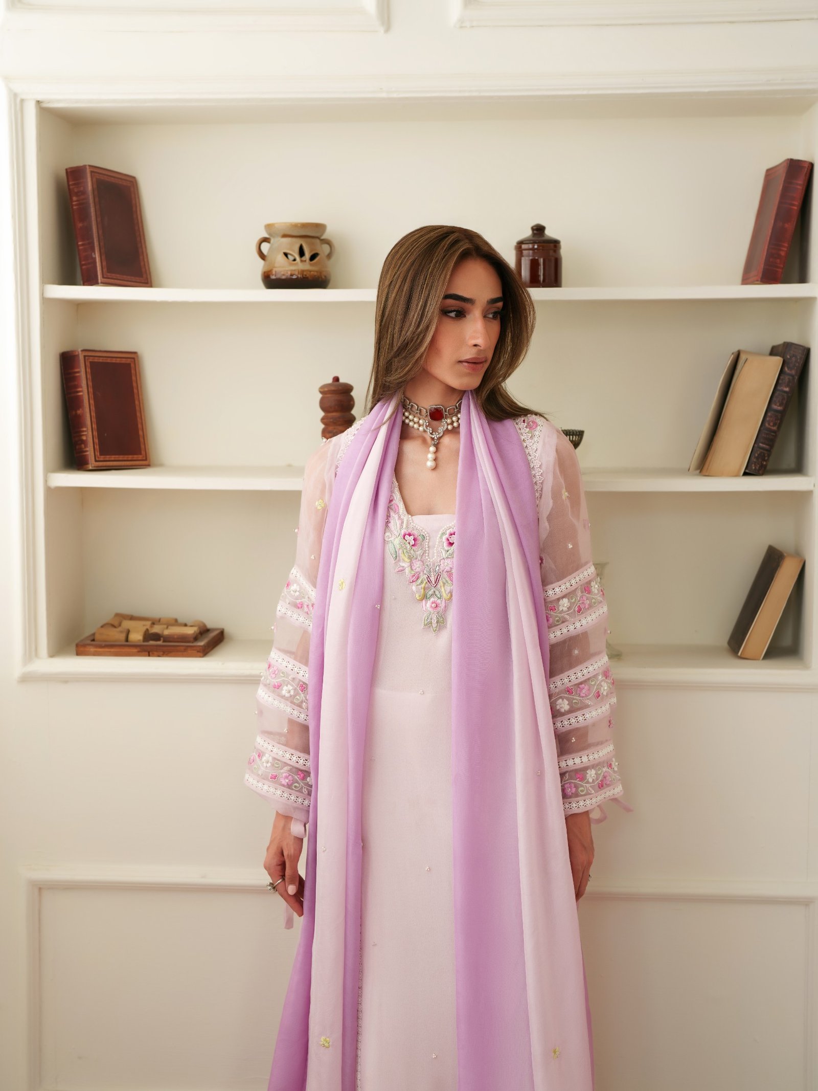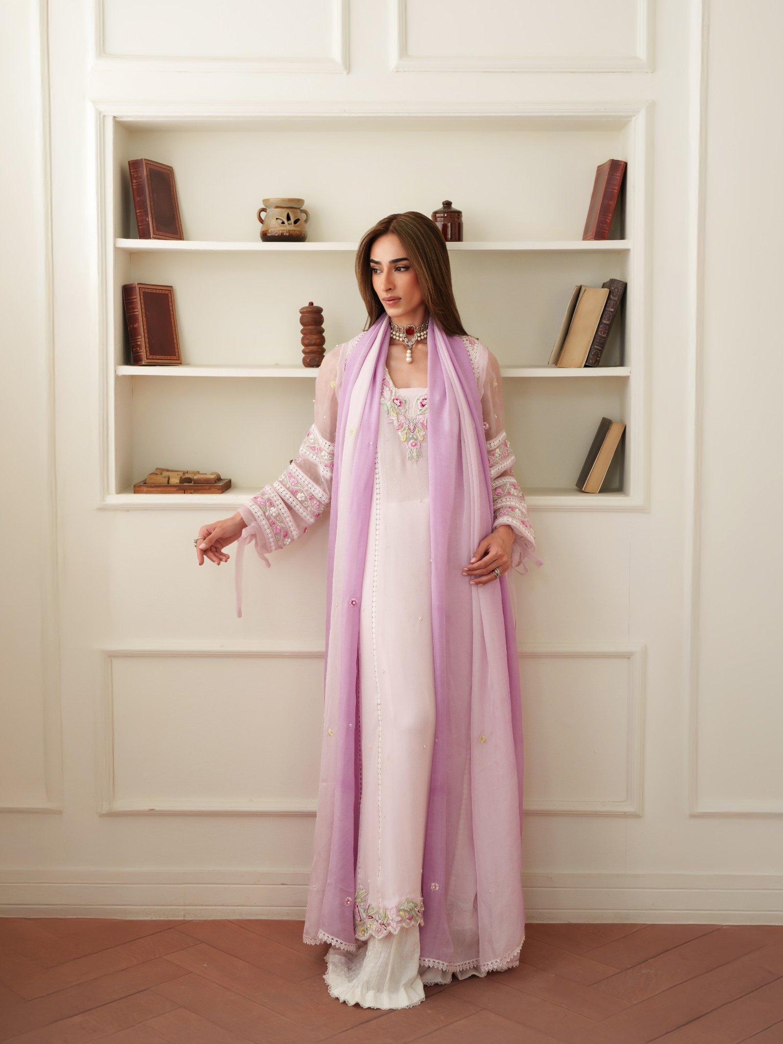Soft and romantic, Roselle is designed in flowing crepe chiffon with subtle embellishments that enhance its feminine charm. Paired with a comfortable viscose trouser and a smooth silk dupatta, this outfit offers effortless grace for both day and evening wear.